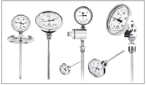 測量氣體和液體的溫度。與玻璃溫度計相比,它具有無汞損壞、讀數(shù)清晰、堅固耐用的優(yōu)點。我生產多用途雙金屬溫度計,規(guī)格品種齊全,質量穩(wěn)定可靠,可廣泛應用于工業(yè)、農業(yè)、國防和科研領域的各個部門。雙金屬溫度計結構特點和工作原理雙金屬 溫度計(以下簡稱溫度計)使用螺旋加熱器雙金屬板作為溫度傳感元件,并將其安裝在保護套中,一端固定(固定端),另一端(自由端)連接到薄軸上,軸端帶有指針。當溫度變化時,溫度傳感元件的自由端立即旋轉,并通過細軸驅動指針以指示刻度盤上的溫度變化。直行溫度計通過轉向傳動機構驅動指針。外殼材料包括鋼板、鑄造鋁合金和不銹鋼板??烧{角度溫度計的頭部可借助波紋管、轉角機構和其他部件從角度調整為直線或從直線調整為角度。